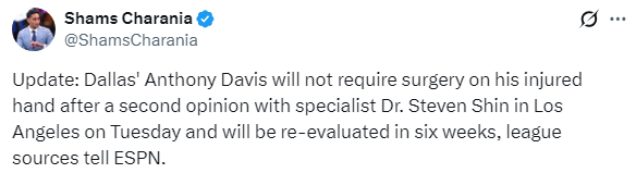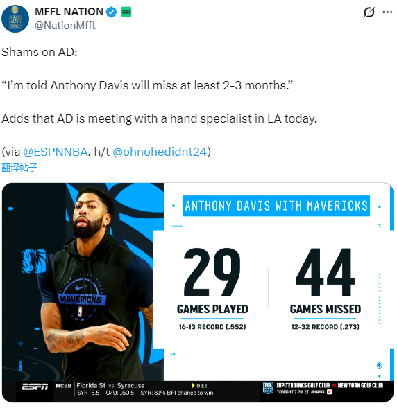 名记Marc Stein报道,达拉斯方面对安东尼-戴维斯能否在三月份复出抱有一些乐观态度,即使他接受左手手术。